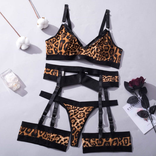 Khaki Sexy Lingerie 4-Piece Set T-Back with Leg Rings G string Thong